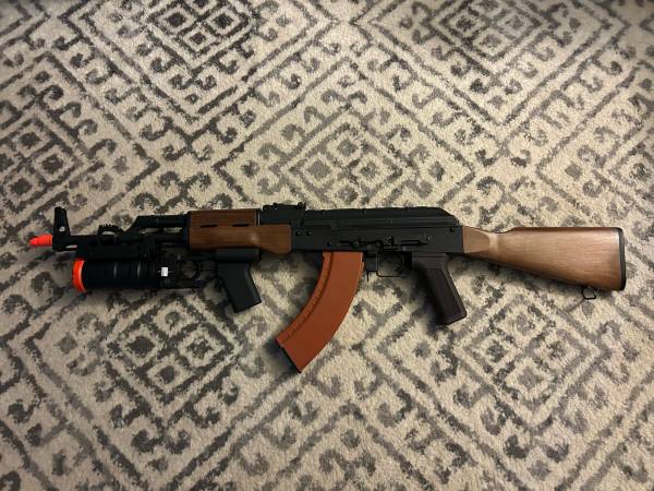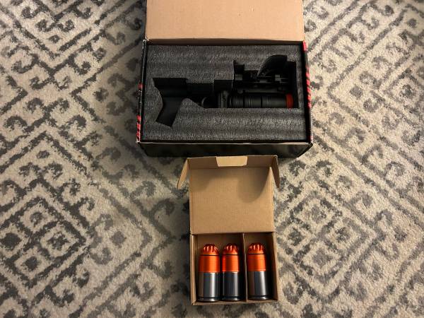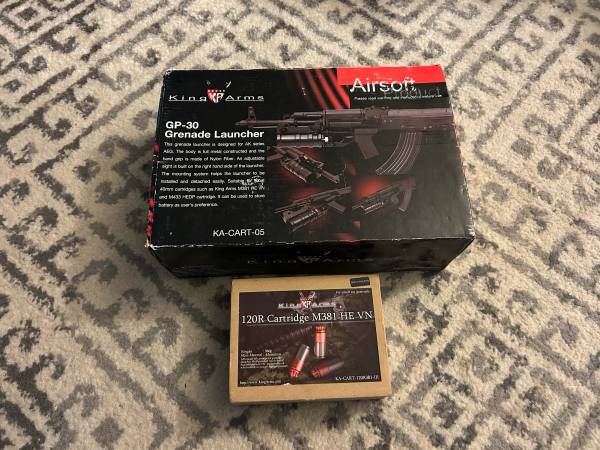 CYMA CM-036 airsoft with King Arms GP-30 launcher. The CYMA worked last time I used it but that was probably nearly a decade ago. I haven’t tested it recently as I don’t have a battery. The GP-30 was used only once as a test fire and never again. The whole package includes all pictured with the CYMA, GP, accompanying shells (3), the gas needed to operate the shells, two high-cap magazines, and 9000 BBs. Looking to sell all together.