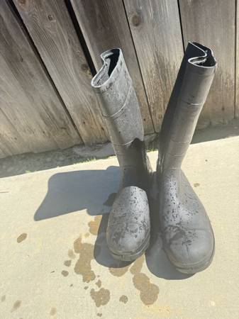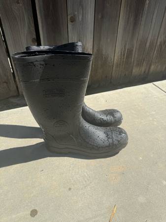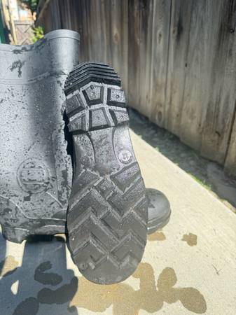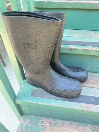 I have a pair of nearly new Steel Toe water proof boots! They don’t have a name brand on them but they do have a subtle logo. Anyway, size 12 Steel Toe Rubber Boots! Water Proof!
