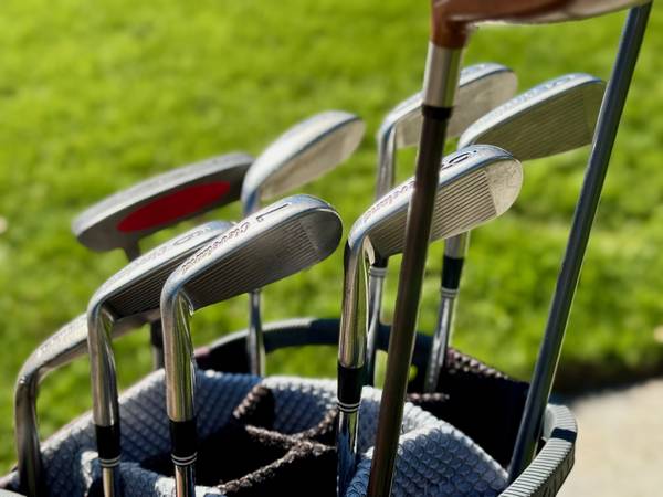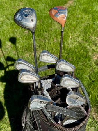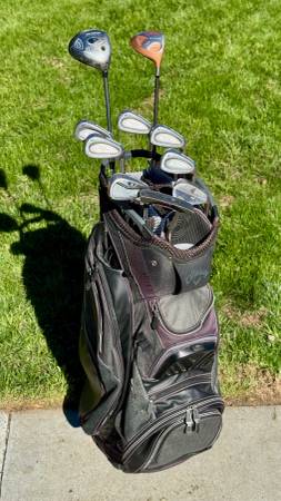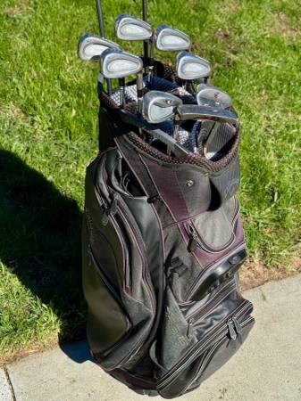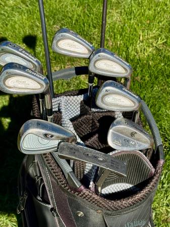 Great playing set of Cleveland Tour Action TA3 irons; 5, 6, 7, 8, 9. Also comes with TaylorMade R7 pitching wedge, Cleveland CG12 60 degree lob wedge, Callaway Big Bertha HawkEye VFT Titanium 11 degree 1 & TaylorMade Burner 3 drivers, a Ram FX3 Model II putter and a beautiful Callaway cart bag with lots of storage. Also comes with some balls and T's, so you have everything you need to get out on the course and start playing.