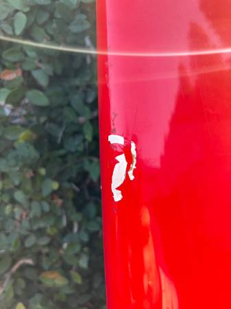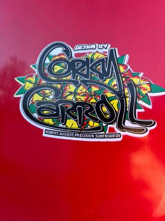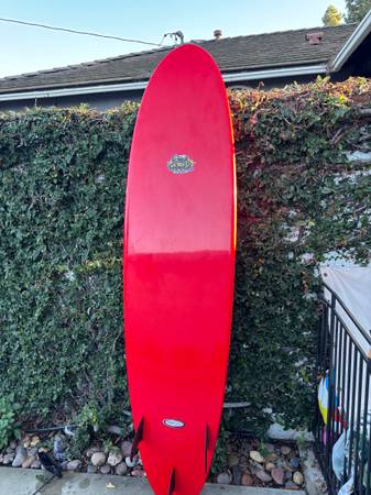 I generally ride a long board, I used this when the waves were big. I’m too old to ride big waves now hence I’m selling it. It’s a beautiful board, it’s a Robert August/Corky Carrol EPOXY board, 7’6” long. It comes with a soft cover even though epoxy boards don’t even need it, this thing it pretty much bulletproof. It is in almost perfect condition. I removed all of the wax because people who are selling tend to cover up problems with wax. It has two small chips, and no pressure dings. I posted a picture of one chip. I paid $650 for it used, I think they sell for $1500.00 brand new. I just want it gone.