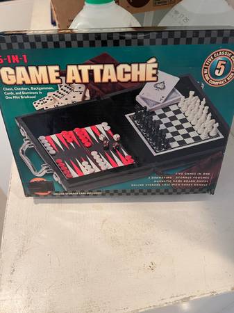 Chess, Checkers, Backgammon, Cards, and Dominoes in one beautiful brief case. 5 games in one. 2 drawstring storage pouches, magnetic game board pieces. Deluxe storage case with carry handle. Portable great to travel with. New in the box never used.