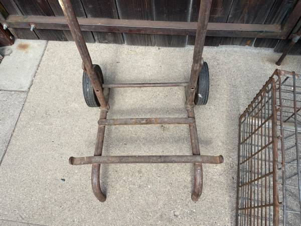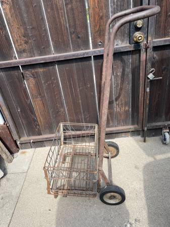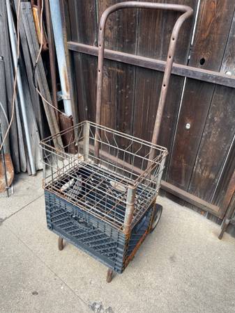 Vintage milk crate delivery dolly & wire crate, holds stacked crates, used but solid condition, $75. No Email or text, call