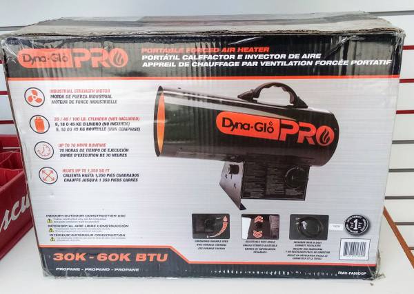 DYNA-GLO PRO 30K-60K BTU PORTABLE FORCED AIR HEATER In new-like condition, features an industrial strength motor, up to 70 hours runtime, propane tank not included. Gardena Pawn Shop 14211 S....