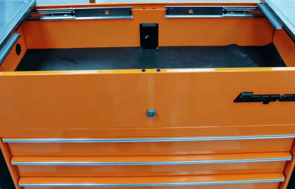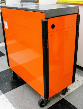 In new-like condition, features six locking drawers, sliding top , corner rubber bumpers, electric orange paint, no keys available. Measures 40.2" W/47" H/ 20" D...Come check it out!