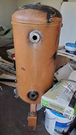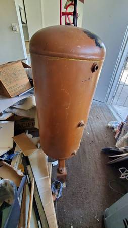Compressor tank about 18 in in diameter and 4 ft tall, perhaps a little taller than 4 ft.