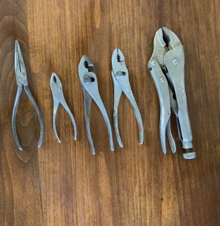 from left to right Snap On 96 needle nose pliers-$20 SnapOn pliers 44-$15 (2) Cee Tee Co slip joint pliers-$5 each Vise-Grip locking pliers 10 WR- $10 All made in the U.S.A. call or text