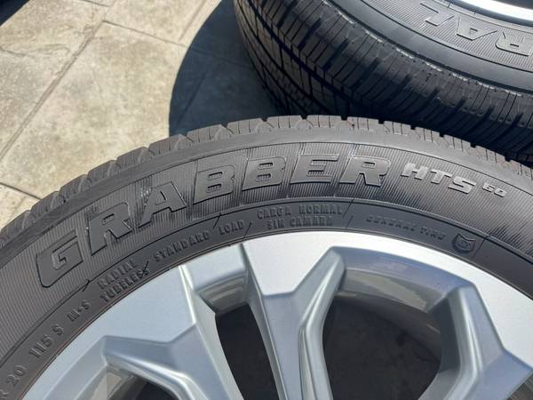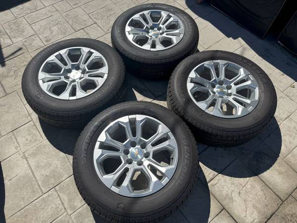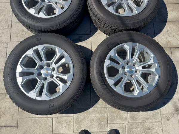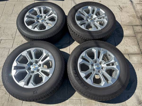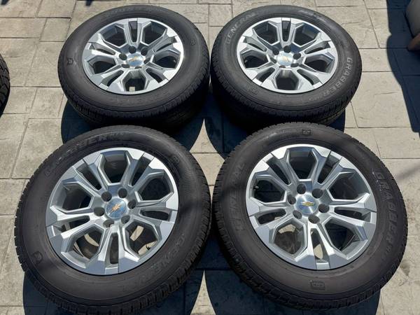 Selling complete like new condition set of 20 Chevy Silverado Tahoe LTZ Alloy Factory OEM wheels General 275/60/20 Tires excellent condition. Rims are clean no damage. with tire pressure sensors included.