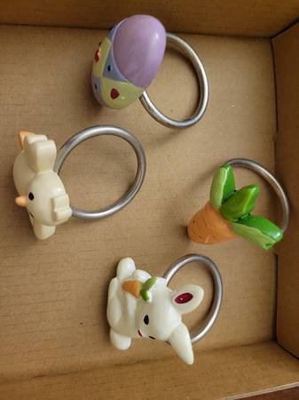 Four little candle holders, 4 candles, and 4 napkin rings. This is a set. only.