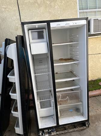 side by side refrigerator / freezer works great just needs good cleaning and doors re-attached. Pick up from driveway - easily visible from street. address provided by return email