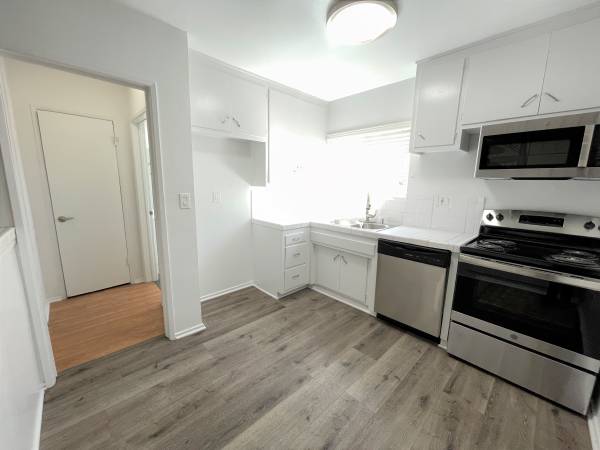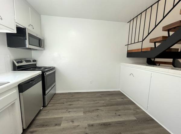 Kitchen with white tile countertops, brand new stainless steel appliances (electric stove/oven, over-the-range microwave, and dishwasher), stainless steel sink with a tall-spout/pull-down faucet, a small new window above with new wooden horizontal blinds, new light fixture, and plenty of cabinet space. Area is big enough to fit a table and chairs.