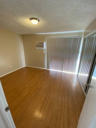Second Bedroom with a new ceiling fan with a light fixture on a digital dimmer switch, a walk-in closet, wall A/C unit, USB port/outlet, and a large new window with new wooden horizontal blinds.