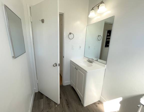 Hallway Bathroom with a modern vanity, mirror and light sconce above, bathtub with tiled walls, an overhead heater/exhaust fan, and all new accessories.