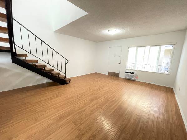 Living room with fresh paint and new wood floors (throughout) large new double pane window with new wooden horizontal blinds, a new wall A/C-heater combination unit, hardwood staircase with wrought iron railing, and is open-concept to the kitchen.