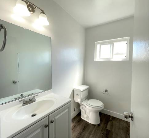 Half Bath is located downstairs with a modern vanity, large mirror and light sconce above, mirrored medicine cabinet, window, toilet, and all new accessories.