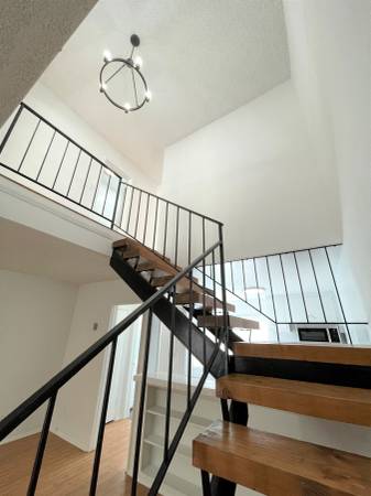 Wood staircase with wrought iron railing and new light fixture leads you to the upper level.