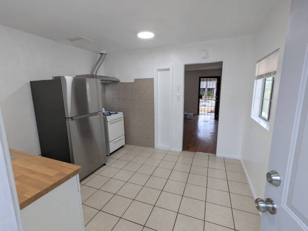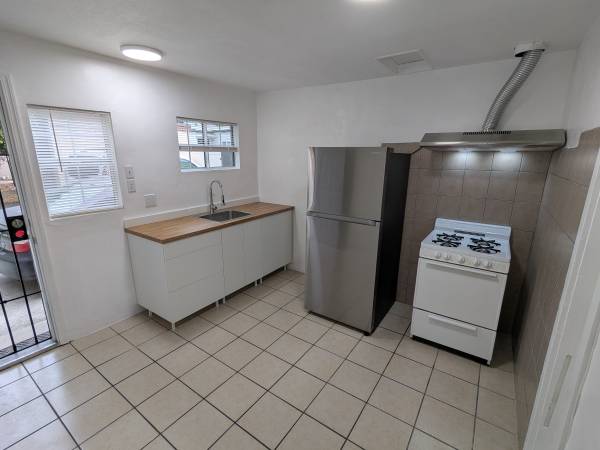 - Brand new kitchen cabinets, countertop, sink, faucet, and range hood with roof venting.