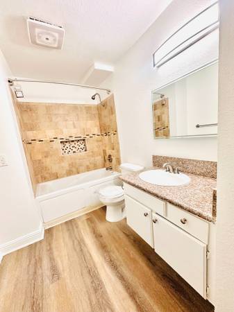 Bathroom with tile flooring, long vanity with a new LED-lit/anti-fog mirror and light sconce above, new mirrored medicine cabinet, Jacuzzi bathtub with beautiful custom tiled walls with built-in shower niche, overhead heater/exhaust fan, and all new accessories.