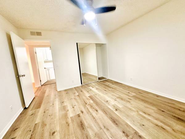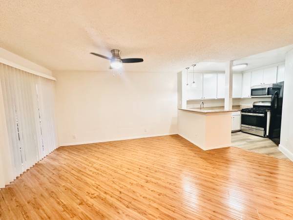 Spacious Living Room with central a/c, waterproof wood flooring, and fresh paint (throughout), USB port/outlet for convenient charging, sliding glass door with vertical blinds to access your balcony!