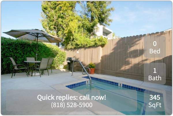 Community Features: ● 24 Hour Availability ● Assigned Gated Parking ● Beautiful Landscaping ● Laundry Facility ● Public Transportation ● Responsive Maintenance ● Smoke Free ● Sorry, No Pets ● Sprinkler System ● Access to Shopping, Dining, and Recreation ● Controlled Access Entry ● Friendly, Professional On-Site Management ● Near Metro Orange Line ● Near Universal City Walk ● Outdoor Spa and Sun Deck Area ● Quick access to the 101 and 134 freeways ● Social Area with BBQ Grill