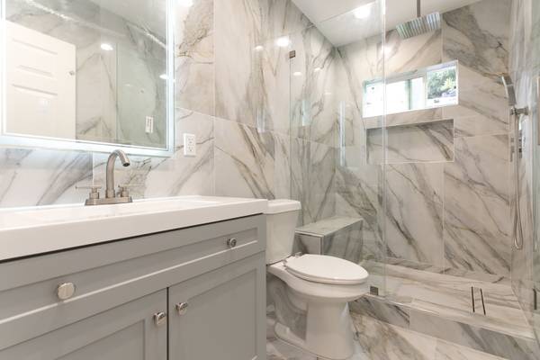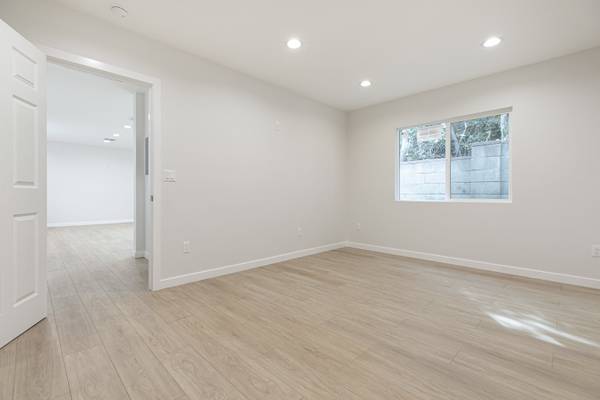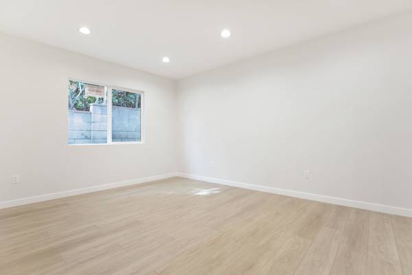 Be the first to enjoy this 1-bedroom, 1-bath back house offers approximately 650 sq. ft. of bright, modern living space with recessed lighting, new flooring, and an open-concept layout. The spacious living area flows into a stunning updated kitchen featuring white shaker cabinets, quartz countertops, and a brand-new stainless steel stove with a sleek hood. The bedroom includes large mirrored closet doors, while the luxurious bathroom showcases floor-to-ceiling marble-style tile, a glass-enclosed shower with a rainfall showerhead, built-in bench, and an LED-lit vanity mirror. The unit is located behind a secure gated entrance for added privacy, and includes one designated parking space. This move-in-ready home offers a private, clean, and stylish living environment perfect for anyone seeking comfort and convenience. Water included!!