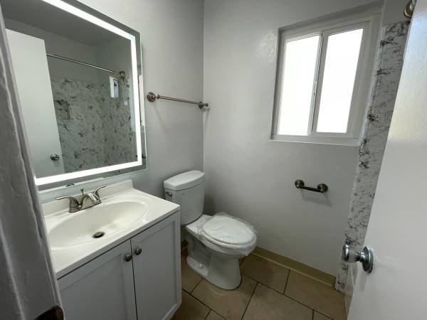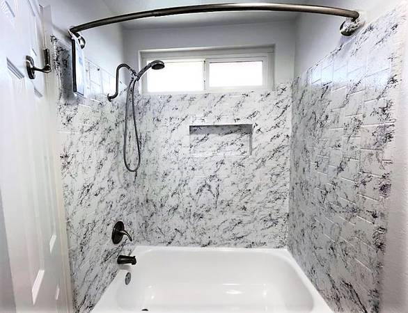 The bathroom is finished with tile flooring, a modern vanity with an LED-lit anti-fog mirror and light sconce, a mirrored medicine cabinet, a freshly glazed bathtub with marble-tiled walls, a curved shower rod and curtain, a window, and new accessories throughout.