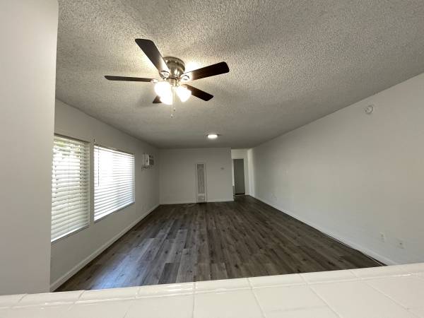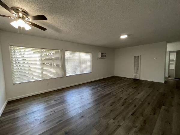 The living area offers fresh paint, wood floors with base molding throughout, a large side window with wooden horizontal blinds, a wall A/C unit, a gas wall heater, a ceiling fan with lights on a digital dimmer switch, and a convenient USB charging outlet.