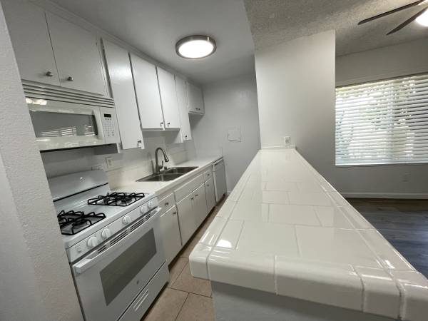 The open-concept kitchen flows into the living room and features white tile countertops, a bar overlooking the living area, a gas stove/oven, dishwasher, over-the-range microwave, stainless steel sink with a tall spout faucet, ample cabinet space, and a new light fixture.