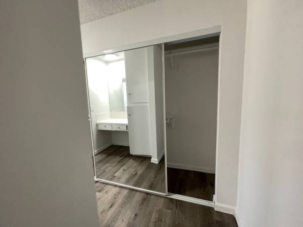 The back hallway includes a closet with sliding mirrored doors as well as a built-in cabinet and counter/vanity area with a mirror above.