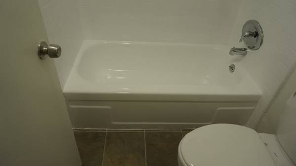 Bathroom has tile flooring, bathtub with tiled walls, new shower rod and curtain, and all new accessories.