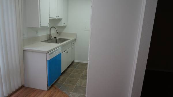 Kitchen has tile flooring, nice countertops, all white appliances including a dishwasher, an overhead microwave, and gas stove, a large floor-to-ceiling window with vertical blinds, and a new light fixture.