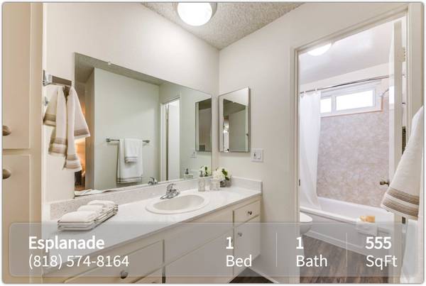 Looking for a great location at an affordable price? The Esplanade is the answer! Our West Valley apartment community is located near the tranquil Lake Balboa Recreation Center with three public golf courses, putting greens, driving ranges, tennis courts, jogging & bike paths and boating on Balboa Lake. The Sherman Oaks Galleria is only one of the wonderful shopping options that are conveniently located close by. Commuters have easy access to the 101, 118 and I-405 freeways and the Metro Orange Line, which are located just minutes away.