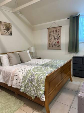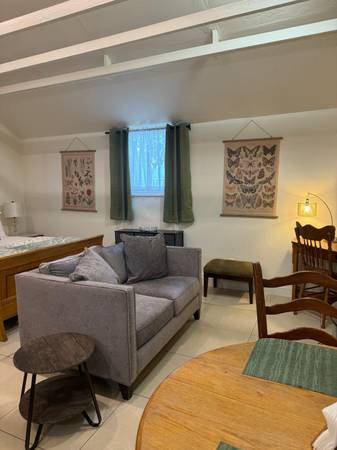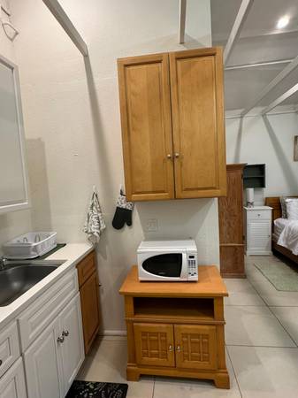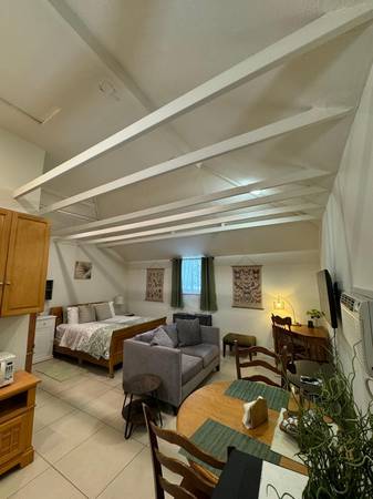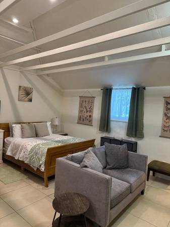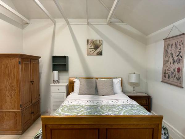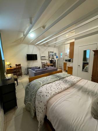 Quiet gated home on tree-lined street, walking distance to Target and Costco. This hidden home, in the upscale neighborhood of Sherman Oaks, is in a quiet neighborhood. A private entrance and small yard bring you to the entrance. Inside you will find a queen bed, comfy sofa, and granite countered kitchen. The tiled floor, desk area, and comfortable-sized bathroom are modern and clean, additionally wireless high-speed internet and HD TV; this is a home-from-home. A fully furnished kitchen, a desk, a selection of books, white towels, and fresh white linens will complete your stay. You can book for a month and add additional months as needed.