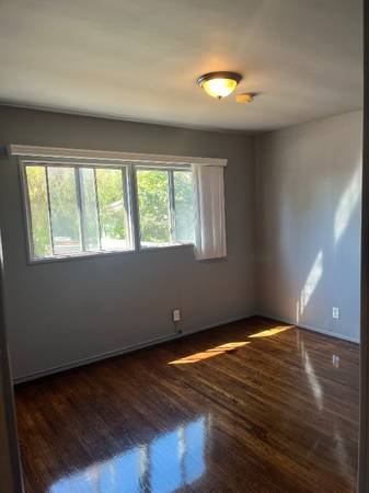 Huge private two bedroom one bath in quiet small building. Unique unit has no common walls with any other unit. Upstairs rear unit with privacy from every window. Both bedrooms have treetop views and no other unit looking in your windows. Bedroom #1 is 18’ x 14‘ Bedroom #2 is 12‘ x 12‘ Giant eat in kitchen with room for a table for four. Refrigerator, dishwasher, stove, and lots of cabinets. Gorgeous, real oak hardwood floors throughout entire unit. 8’ patio door in living room opens up to unusually large 4‘ x 30‘ balcony. Very private entryway area, nobody will ever walk by your front door. This is not a motel style building where everybody walks by your front door and looks in your windows. Spacious bathroom with 6 foot countertop and two separate medicine cabinets. Bathroom features electric wall heater with blower. Toilet features, a water bidet function. Huge linen closet in hall. One car garage with storage. Dog or cat welcome, weight restrictions apply. Call Michael to see unit.