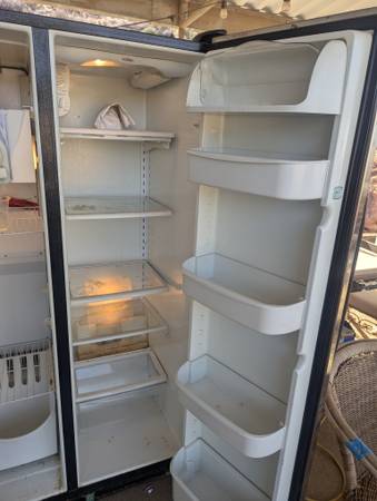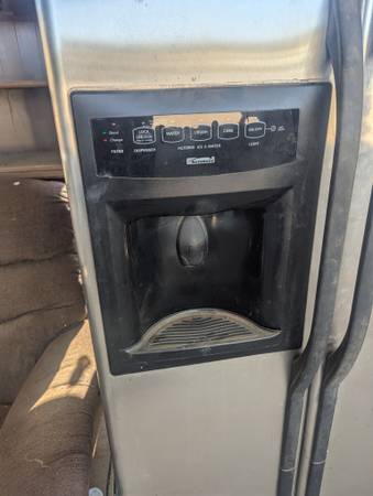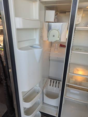Kenmore side-by-side refrigerator freezer, stainless steel. Water dispenser and ice maker. One freezer rack needs two plastic clips replaced to hold it up. 70" high, 36" wide, 30" deep. Approx. 25...