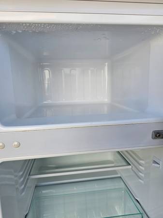 Fridge/Freezer Combo (freezer above fridge) that tends to run on the cool side! Temperature control is a simple dial inside the fridge.