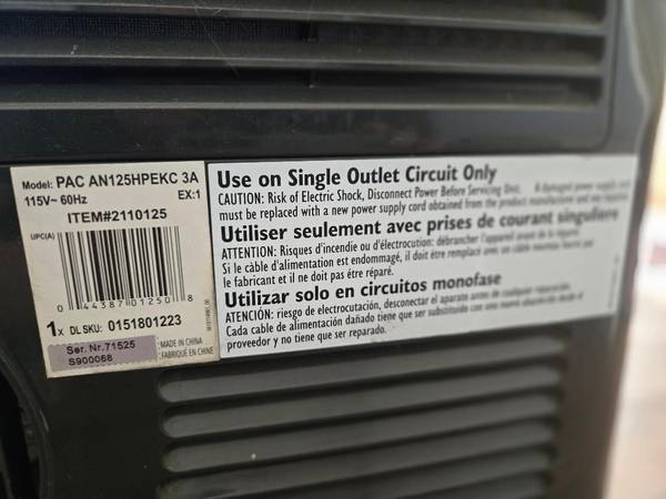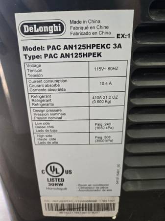 DeLonghi 125HPEKC single hose. Portable AC unit in great condition. Cooling power is 12500 BTU. Covers about 450 sq ft room size. It comes with accessories. Missing remote control.
