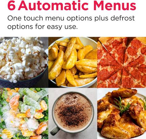 Six Auto Cook Options – This easy-to-use microwave countertop unit features pre-programmed options for frozen pizza and meals so you can get to cooking instantly.