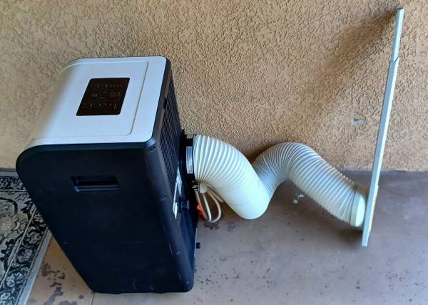 This portable air conditioner is in excellent condition, bought new a few years ago. 115V, see photo for full specs. The tube attaches to the back of the unit and to the window with the fittings. collapsible tube, and window fittings included. With remote control works great.$100