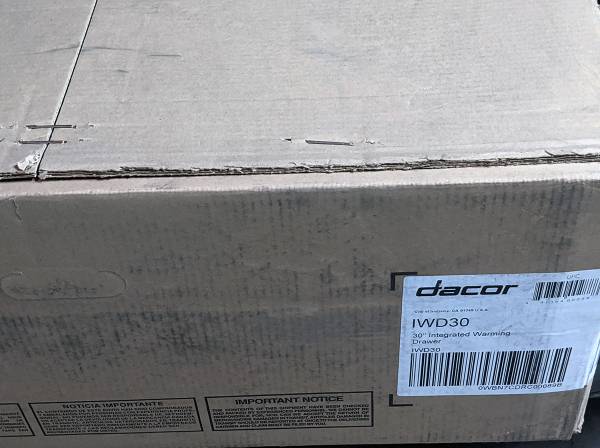 Offered for your consideration: Dacor IWD 30 inch integrated warming drawer. Average retail price for this version is around $1800. This one is brand new in a sealed box. Please keep in mind that the box is pretty big, it is 36X32X13 inches, just make sure it will fit in your car. If interested please contact at show contact info