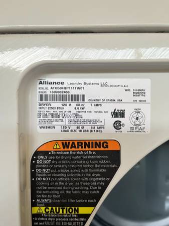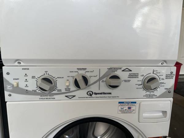 Selling a used but fully functional Alliance / Speed Queen stacked washer & dryer combo (model ATG50FGP111TW01). Washer + gas dryer in one stacked unit