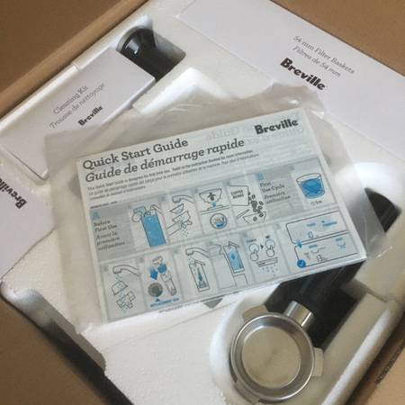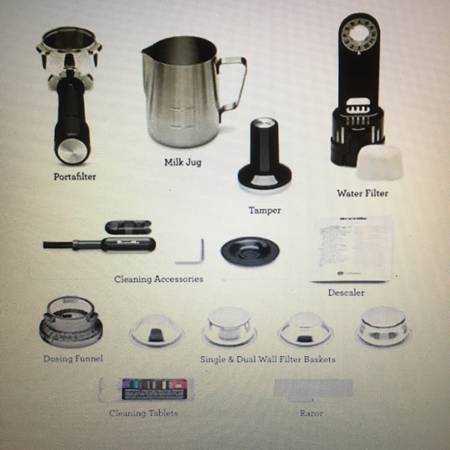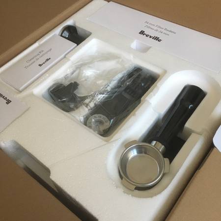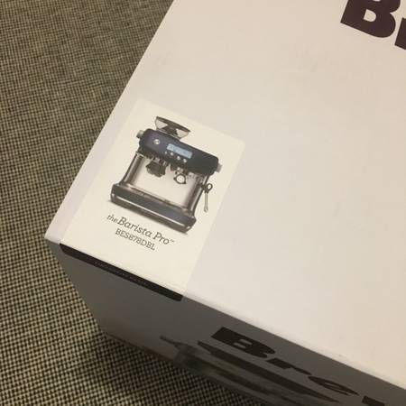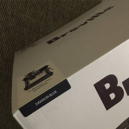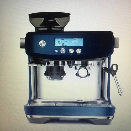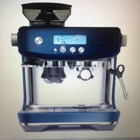 This Espresso/Coffee Machine is powerful: 1680W/15 Bar Italian Pump Pressure, Model: BES878DBL, made of high quality Stainless Steel in Damson-Blue color/finish. BRAND NEW in BOX.