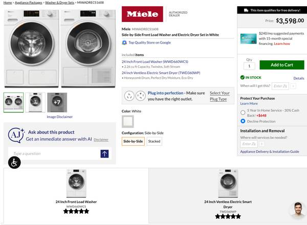 Up for sale brand new in the box Miele WWD660WCS. 24 Inch Front Load Smart Washer with 2.26 Cu. Ft. Capacity, TwinDos®, Automatic Load Control, WiFiConn@ct, 24 Wash Cycles, Sanitize, Wrinkle-Free, Child Lock, and ENERGY STAR® Certified, Digital and Knobs, Stackable. Retail over $1900 and TWD360WP. 24" Heat Pump Dryer by Miele comes with 4.02 cu. ft. Capacity and features a Honeycomb Drum, ventless performance, PerfectDry Moisture Sensing Technology, ComfortSensor user interface, 19 programs including SoftSteam, FragranceDos, and is EnergyStar rated.Retail over $1700. I’m selling set for $2750 Cash pick up only. Please contact Rob at (213)210*39*90 Only if price and item is right for you. For additional specs visit Miele website. If you see posting don’t ask if’s available. No emails please.