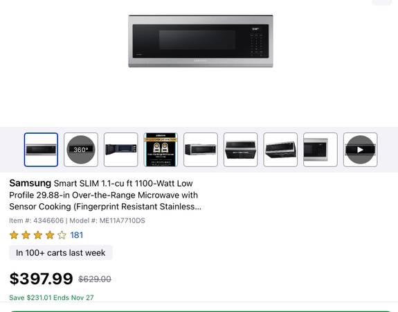 Up for sale brand new in the box Samsung ME11A7710DS, 30 Inch Slim Over-the-Range Smart Microwave with 1.1 Cu. Ft. Capacity, 4-Speed 550 CFM Motor, 10 Power Levels, Sensor Cooking, Cooktop Lighting, Dual Grease Filter, Wi-Fi, Voice Control, and Child Lock: Fingerprint Resistant Stainless Steel. Retail over $600, Selling for $350 Cash pick up only. Please call or text Rob at (213)419*32*00 Only if item and price is right for you. For additional specs about this product visit their website. Please don’t ask still available if you see this ad.
