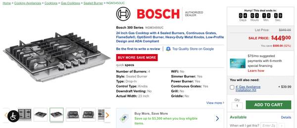 Up for sale brand new in the box Bosch 300 Series NGM3450UC. 24 Inch Gas Cooktop with 4 Sealed Burners, Continuous Grates, FlameSafe®, OptiSim® Burner, Heavy-Duty Metal Knobs, Low-Profile Design and ADA Compliant. Retail over $1000, Selling for $450 Cash pick up Only. Please Call or Text George at (213)419*32*00 Only if price and item is right for you. For additional info visit their website. If you reading this ad, still available please don’t ask. Emails wouldn’t be answered.