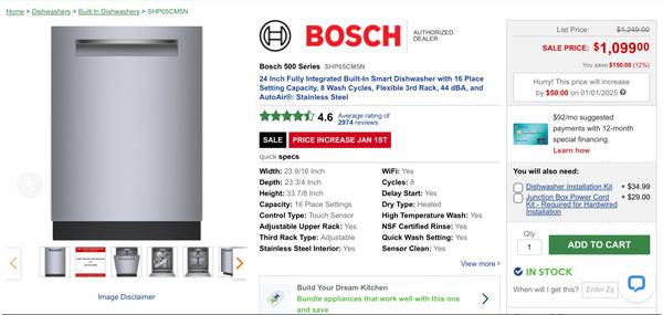 Up for sale brand new out of box Bosch 500 Series SHP65CM5N. 24 Inch Fully Integrated Built-In Smart Dishwasher with 16 Place Setting Capacity, 8 Wash Cycles, Flexible 3rd Rack, 44 dBA, and AutoAir®: Stainless Steel. Retail over $1300, Selling for $750 Cash Pick Up Only. Please call or text Rob at (213)210*39*90 Only if price and item is right for you. No emails would be answered. For more details about this product please visit their website. As long as posting up still available please don’t ask.