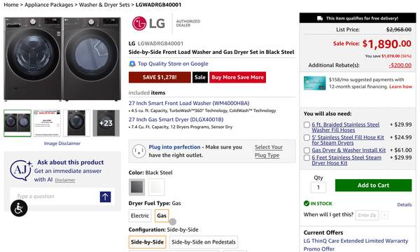 Up for sale brand new floor display LG WM4000HBA. 27 Inch Front Load Smart Washer with 4.5 Cu. Ft. Capacity, SenseClean™, SmartThinQ®, SmartDiagnosis™, Wi-Fi, 12 Wash Cycles, Steam, Quick Wash, Sanitary, Allergiene™, ColdWash™, NSF Certified, and Energy Star® Rated: Black Steel. Retail over $1400, and LG DLGX4001B. 27 Inch Gas Smart Dryer with 7.4 Cu. Ft. Capacity, Dial-A-Cycle™, LoDecibel™, FlowSense™ Clogging Indicator, Wi-Fi, SmartDiagnosis™, 12 Dryer Programs, Sensor Dry, Steam, SteamSanitary™, Wrinkle Care, and ENERGY STAR®: Black Steel, Retail over $1500. Totally set comes $2900, I’m selling set for $1500. Please contact Rob at (213)210*39*90 Only if price and item is right for you.For additional info visit LG website.