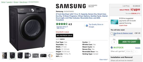 Up for sale brand new out of box Samsung DVG45T6000V, 27 Inch Gas Dryer with 7.5 cu. ft. Capacity, Sensor Dry, Smart Care, Eco Dry, 10 Dryer Programs, 9 Dryer Options, Sanitize Cycle, Interior Drum Light, Lint Filter Indicator, Reversible Door, and ADA Compliant, Black. Retail over $1100, Selling for $650 Cash pick up only. Please call or text Rob at (213)210*39*90 Only if price and item is right for you. Emails wouldn’t be answered. If you see the posting, still available please don’t ask. For additional details about this item visit their website.