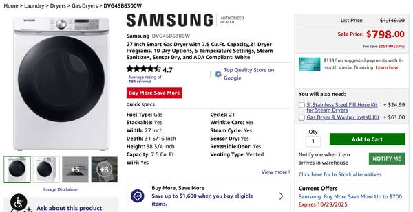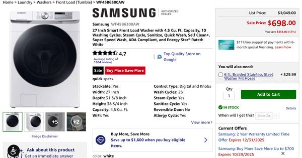 Up for sale brand new floor display Samsung WF45B6300AW. 27 Inch Smart Front Load Washer with 4.5 Cu. Ft. Capacity, 10 Washing Cycles, Steam Cycle, Sanitize, Quick Wash, Self Clean+, Super Speed Wash, ADA Compliant, and Energy Star® Rated: White and Samsung DVG45B6300W. 27 Inch Smart Gas Dryer with 7.5 Cu.Ft. Capacity,21 Dryer Programs, 10 Dry Options, 5 Temperature Settings, Steam Sanitize+, Sensor Dry, and ADA Compliant: White. Retail for the set is over $2200, Selling for $1250 Cash Pick up only. Please call or text George at (747)261*11*88 Only if price and item is right for you. If posting up still available please don’t ask. Emails wouldn’t be answered. For additional info visit their website.