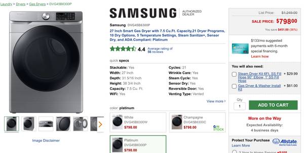 Up for sale brand new open box Samsung DVE45B6300P, 27 Inch Gas Smart Dryer with 7.5 Cu.Ft. Capacity, Steam Sanitize+, Sensor Dry, Wi-Fi Connectivity, 21 Dryer Programs, 10 Dry Options, 5 Temperature Settings, Interior Drum Light, Reversible Door, Lint Filter Indicator, 3 Way Venting, and ADA Compliant: Platinum. Retail over $1300, Selling for $550 Cash pick up only. Please contact Rob at (213)210*39*90 Only if price and item is right for you.For additional details visit Samsung website.
