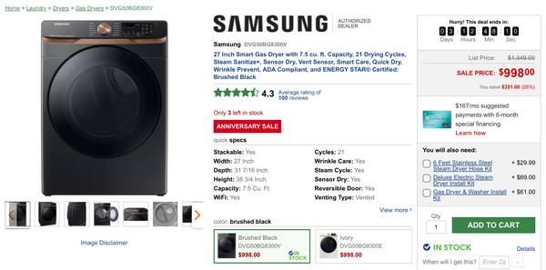Up for sale brand new out of box Samsung DVG50BG8300V. 27 Inch Smart Gas Dryer with 7.5 cu. ft. Capacity, 21 Drying Cycles, Steam Sanitize+, Sensor Dry, Vent Sensor, Smart Care, Quick Dry, Wrinkle Prevent, Wi-Fi, ADA Compliant, and ENERGY STAR® Certified: Brushed Black, Retail over $1400, Selling for $650 Cash pick up only. Please contact Rob at (213)210*39*90 Only if price and item is right for you. For additional info visit their website. No emails would be answered. As long as you see the posting still available please don’t ask.